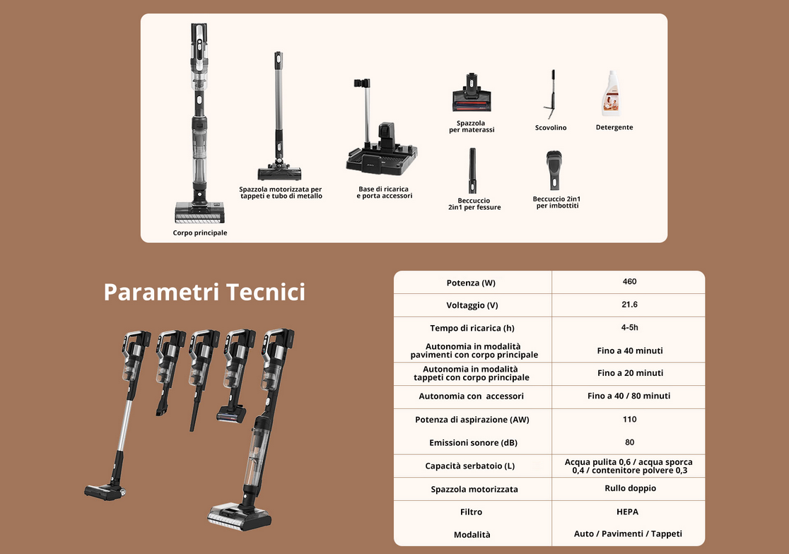Passa dalla modalità lavapavimenti, alla modalità scopa elettrica e aspiratore portatile premendo un solo pulsante.